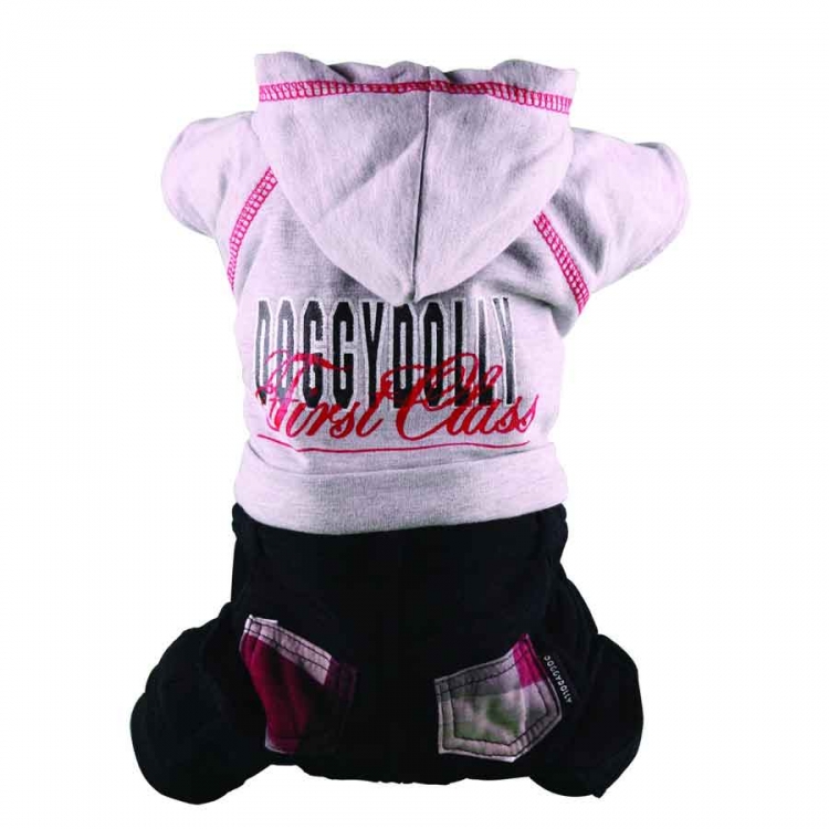 Sportliche graue Hundekombi von Doggydolly Hundemode. Das Oberteil des Hundeoveralls ist aus grauem Sweatstoff, die angenähte Hose aus schwarzem Fleece. Das ideale Outfit für den Spaziergang an kühlen Tagen. Der Hundeanzug wird durch die Aufschrift Doggydolly First Class aufgepeppt. Die Kapuze schützt die empfindlichen Ohren des Hundes vor kaltem Wind. Material: Fleece mit Polycotton und Innenfutter