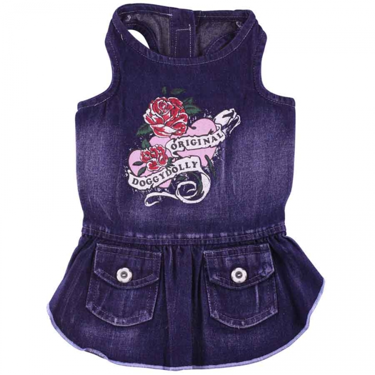 Dieses Jeanskleid mit Rosenmotiv von Doggydolly Hundemode kann wirklich überall un zu jeder Gelegenheit getragen werden. Das Hundekleid besteht aus einem Jeans-Tanktop und einem leicht ausgestellten Jeansrock. Auf dem Rücken des Oberteils ist ein Aufdruck mit zwei roten Rosen, zwei rosa Herzen und Doggydolly Schriftzug. Der Rock hat zwei aufgesetzte Leckerli-Taschen, die mit weißen Blümchenknöpfen geschlossen werden.