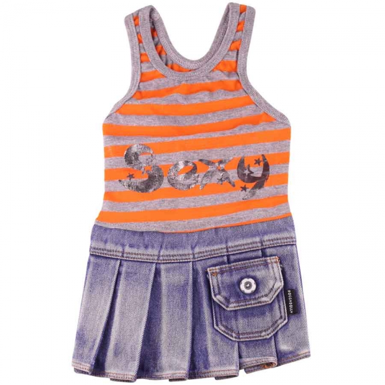 Ein Hingucker der Extraklasse ist dieses Designer-Jeanskleid von Doggydolly Hundemode. Das Tanktop ist aus grau-orange-gestreiftem T-Shirtstoff mit silberglitzerndem Aufdruck "Sexy". Der Jeansrock ist in Falten gelegt und mit modischer, aufgesetzter Tasche versehen. Dieses Hundekleid trägt die selbstbewusste Hundedame zu jeder Gelegenheit und erzielt mit ihren Auftritten größtmögliche Aufmerksamkeit. Farbe:Top grau-orange-gestreift mit SilberaufschriftJeansrock hellblau.