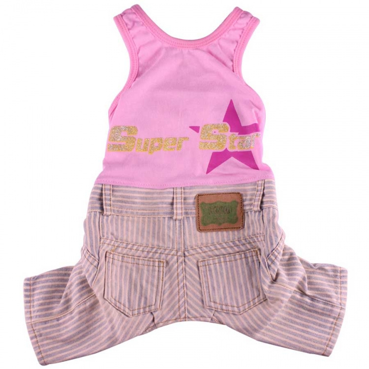 Modische Hundekombi mit weiß gestreifter Jeanshose und rosa Tanktop von Doggydolly Hundebekleidung. Durch den Super Star Aufdruck in gelb und dem pinken Stern bekommt das Tanktop das gewisse Etwas. Diese Hundekombi aus Hose und Top ist das perfekte Outfit für die Superstars unter den Rüden. Dieses Modell ist ebenfalls für Hundedamen als Hundekombi mit Jeansrock erhältlich.