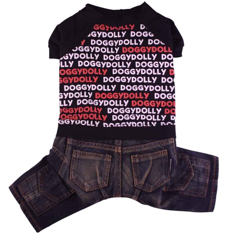 Hundekombi mit dunkelblauer Jeanshose und schwarzem T-Shirt von Doggydolly Hundemode. Das schwarze Hundeshirt ist mit dem Doggydolly Schriftzug in grau und rot bedruck. Die angenehm weiche Hundejeans hat aufgesetzte Taschen um Leckerlies für den Spaziergang zu verstauen. Diese Hundekombi ist ebenfalls in grau erhältlich.