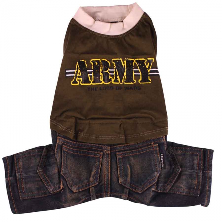 Die coole Hundekombi mit ARMY Aufdruck von Doggydolly Hundemode ist das ideale Outfit für vierbeinige Abenteurer. Die Hundehose ist aus weichem Jeansstoff und hat aufgesetzte Leckerlie-Taschen. Das Hundeshirt ist olivgrün mit einem schwarz-gelben Army-Aufdruck und einem weißen Kragen.