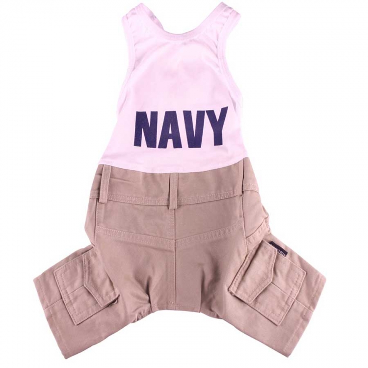 In the Navy... Trendige Kombination aus weißem Tanktop mit der Aufschrift Navy und einer hellbraunen Hose von Doggydolly Hundemode. Due Hundekombi besticht durch den hohen Tragekomfort (superweicher Jeansstoff, stretchiges Baumwolltop) sowie die praktische Anziehweise. Das weiße Hundeshirt trägz die Aufschrift Navy in dunkelblau. Natürlich ist auch für die Aufbewahrung des Reiseproviants in den integrierten Leckerlitaschen der Jeanshose gedacht.