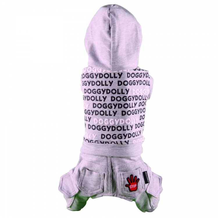 Eine lässige Hosenkombi mit Kapuze in schlichtem grau. Über den ganzen Rücken des Hundeanzugs ist in schwarz und weiß der Markenname Doggydolly aufgedruckt. Auf der rechten Hosentasche des Overalls ist ein kleiner, roter Totenkopf aufgenäht, der die Hose zusätzlich noch aufpeppt. Der Anzug für den Hund ist ideal als Outfit für kühle Tage, aber auch als Hausanzug perfekt.