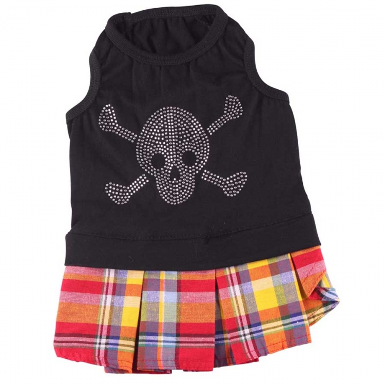 Für freche Vierbeiner - dieses Kleid mit Totenkopf und Schottenrock von Doggydolly Designer Hundemode ist wie gemacht für modebewusste Hunde. Das Hundekleid besteht aus einem schwarzen, ärmellosen Hundeshirt aus elastischer Baumwolle und einem roten Hunderock mit Karo-Muster. Auf dem Oberteil befindet sich ein Totenkopf aus Strass.