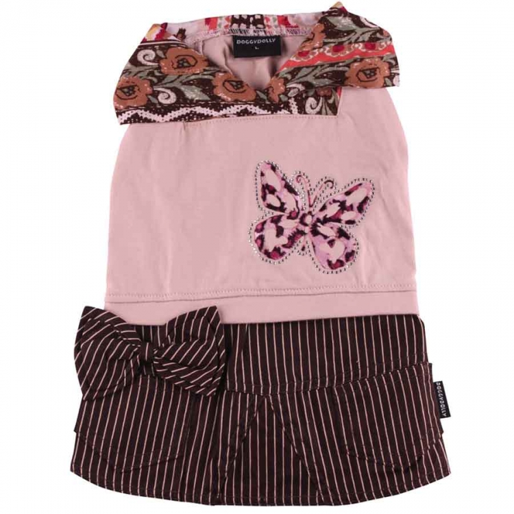 Dieses Kleid von Doggydolly Hundemode ist mit seinen verschiedenen Mustern ein absoluter Higucker. Das Hundekleid besteht aus einem beigen Hundeshirt mit bunt gemusterten Kragen und einem Schmetterling aus rosa gemustertem Stoff, der mit Strass umrahmt ist. Der Rock ist braunbeige-gestreift und gerade geschnitten - seine schlichte Eleganz wird durch eine Schleife an der Seite aufgelockert.