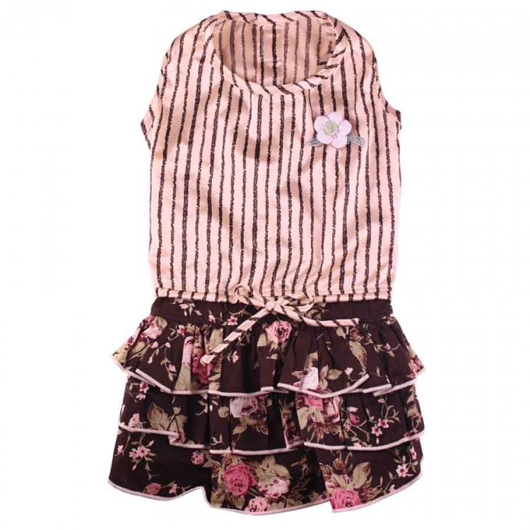 Dieses Kleid von Doggydolly Hundemode ist bei jeder Gelegenheit ein richtiger Blickfang! Das Oberteil des Hundekleids ist beige mit dunkelbraunen Streifen und hat oben links eine kleine, aufgenähte rosa Blume. Als Übergang zum Rock ist eine kleine Kordel in den Farben des Oberteils zu einem Schleifchen gebunden. Der Rock ist dunkel und mit einem Blümchen-Muster verziert.