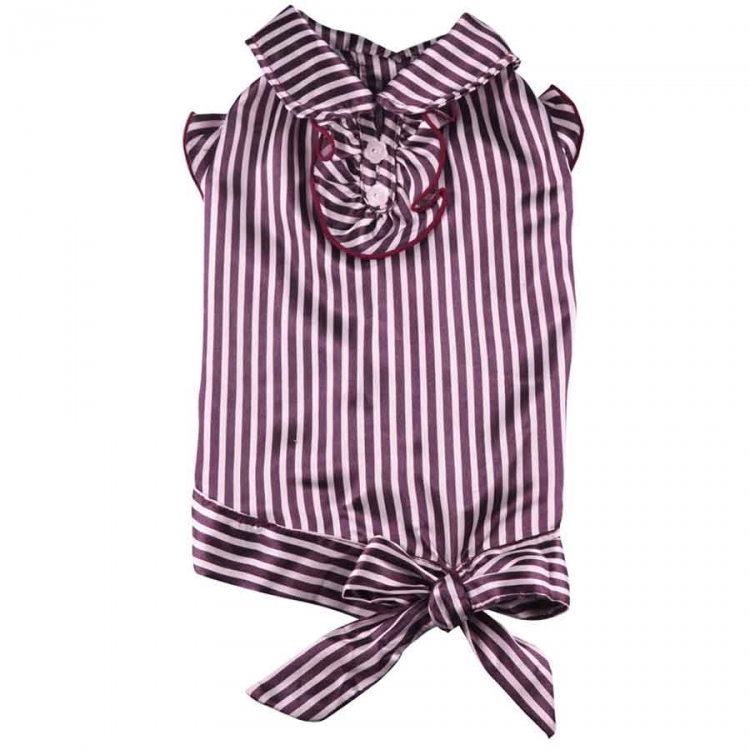 Diese Bluse von Doggydolly Hundebekleidung ist ein Highlight im Kleiderschrank jeder Hundedame. Die Hundebluse ist rosa-gestreift und hat einen breiten Saum, der an der Seite zu einer Schleife gebunden wird. Um die Knöpfchen ist die Bluse gerüscht. Wie bei einer normalen Bluse für Zweibeiner hat auch dieses Modell einen Kragen. Damit sieht Ihr Hund absolut schick und elegant aus. Die Hundeblusen lassen sich gut mit den Röcken aus der Doggydolly Kollektion kombinieren. Die Bluse gibt es auch in weiß mit Blümchenmuster.