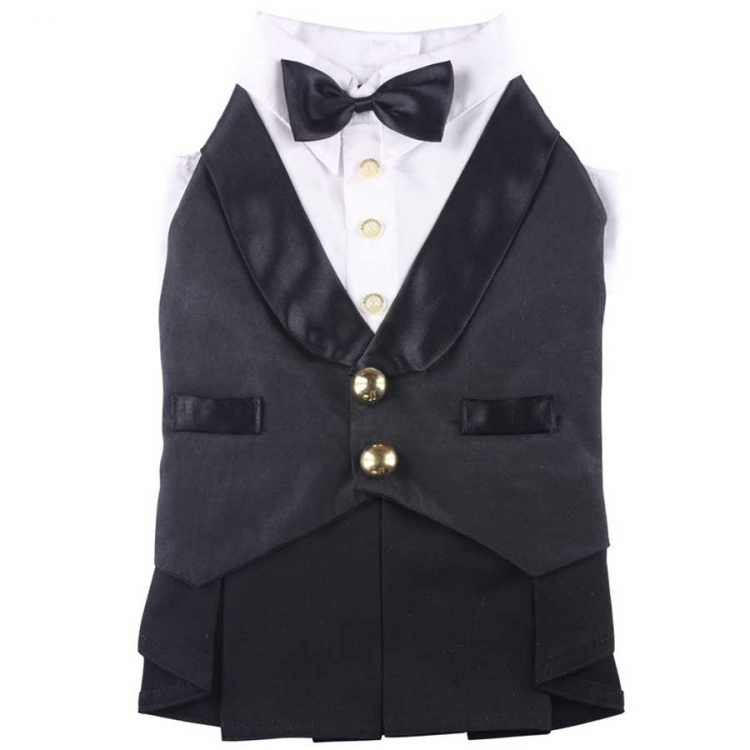 Mit diesem Modell vom Designerlabel Doggydolly Hundemode erhalten Sie ein elegantes Hundekostüm mit Rock. Das Oberteil ist ein Hundejackett in schwarz mit eingenähter weißer Bluse und einer schwarzen Fliege. Das Jackett wird von zwei goldenen Knöpfen geschmückt. Das Hundekostüm wird von einem schlichten, schwarzen Faltenrock vollendet. Durch den Klettverschluss am Bauch ist der Hundeanzug einfach an- und auszuziehen. Dieses Hundekostüm gibt es auch mit weinrotem Oberteil.