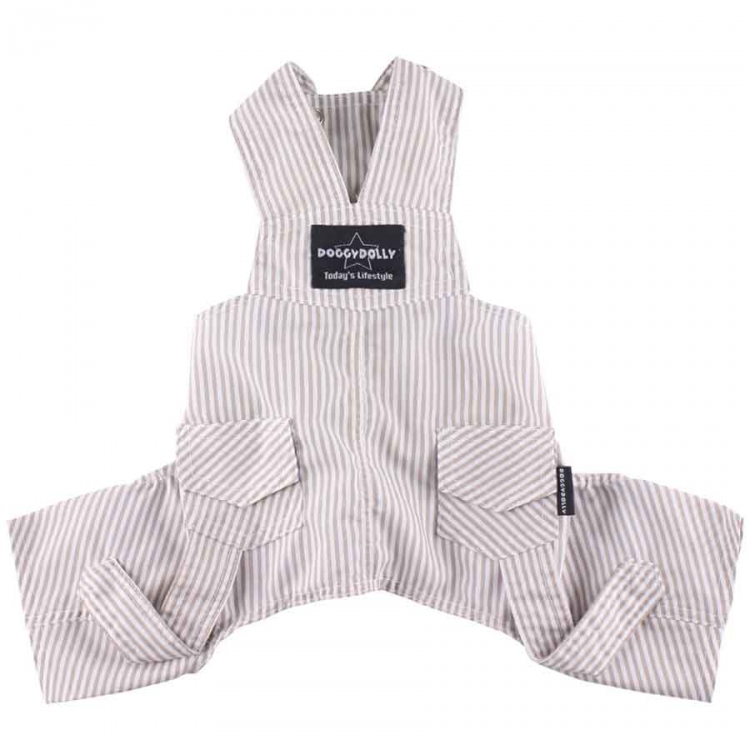 Die crème-weiß gestreifte Latzhose von Doggydolly Hundebekleidung ist ein ideales Outfit für den Sommer. Die Hose für Hunde ist aus leichtem Baumwollstoff und wird mit Druckknöpfen verschlossen. Die Träger der Hundehose sind auch mit Druckknöpfen verstellbar und dadurch an die Körperform des Hundes anpassbar. Die Hose kann mit den Shirts aus der Doggydolly Kollektion kombiniert werden.