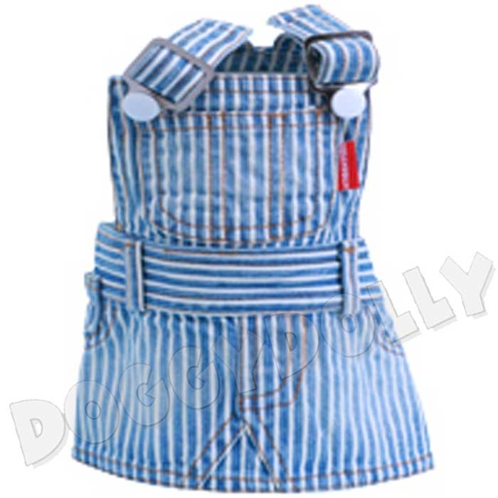 Fetziger weiß-hellblau gestreifter Jeanslatzrock, super trendy und lässig für die modebewusste Hündin. Ein Blickfang sind die aufgenähten Leckerli-Taschen. Läßt sich wunderbar mit einem Tanktop oder einem T-Shirt kombinieren. Farbe: hellblau-weiß gestreifter Denim-Jeansstoff verstellbare Träger Bauchumfang durch Druckknöpfe regulierbar.
