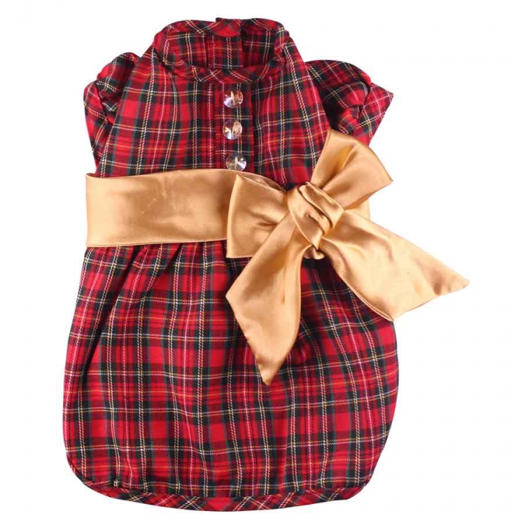 Dieses goldige Hundekleid vom Designerlabel Doggydolly Hundemode ist rot-kariert und für die Weihnachtsfeiertage das perfekte Outfit. Am oberen Teil des Hundekleides befinden sich kleine Knöpfchen. Eine große, goldene Schleife ist das Highlight dieses Models.