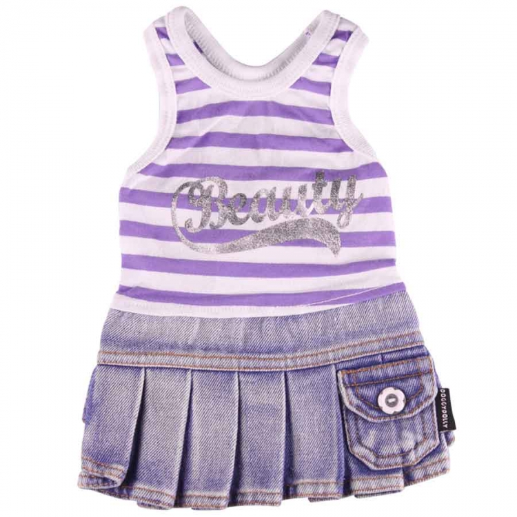 Mit diesem lila gestreiften Jeanskleid von Doggydolly Hundebekleidung kann der Sommer kommen. Das Hundekleid besteht aus einem lila-weiß gestreiften Tanktop und einem Faltenrock aus hellblauen Jeansstoff. Auf dem Tanktop ist das Wort Beauty in silberner Farbe aufgedruckt. Den Faltenrock verziert ein kleines Leckerlie-Täschchen auf der rechten Seite. Dieses Kleid ist auch in rosa und blau erhältlich.