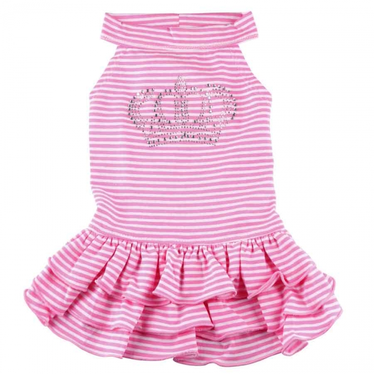 Das Shirtkleid aus rosa-weiß gestreifter, elastischer Baumwolle von Doggydolly Hundemode ist nicht nur angenehm zu tragen, mit der Strasskrone ist es auch ein richtiger Blickfang! Genau das richtige Hundekleid für die anspruchsvolle Hundedame - die Krone macht klar, wen man vor sich stehen hat. Der Hunderock ist im Lagenlook und das Kleid hat einen sportlichen Kragen. Der Rücken ist mit einer großen Krone aus weißem Strass verziert. Dieses Sommerkleid ist auch in hellblau erhältlich. Maße: Rückenlänge Brustumfang XS 24cm 26cm S 27cm 28cm M 35cm 36cm L 4cm 42cm XL 4cm 44cm XXL 46cm 5cm