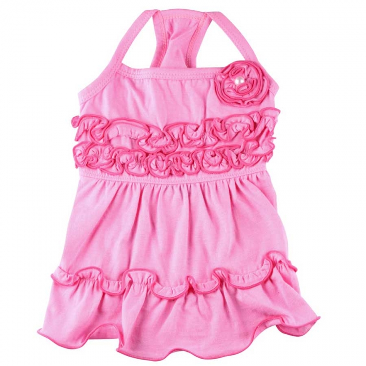 Mit diesem hübschen pinken Sommerkleid von Doggydolly Hundebekleidung ist Auffallen garantiert. Das Hundekleid besteht aus einem Tanktop mit Rüschen und einer aufgenähten Stoffrose sowie einem Rock im Lagenlook. Die Rüschen erinnern an ein spanisches Flamenco Kleid - damit kann die Party losgehen! Trotz der aufwändigen Verarbeitung ist das Kleid durch den elastischen Baumwollstoff angenehm zu tragen. Das Kleid ist ebenfalls in schwarz und weiß erhältlich.