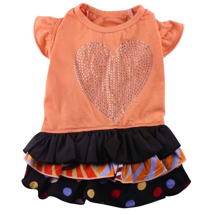Mit diesem flippigen Kleid von Doggydolly Hundemode kommt Ihre kleine Dame überall gut an. Das Hundekleid hat ein orangenes Oberteil mit großem, glitzerndem Herz aus Strass. Der Rock besteht aus drei Lagen in unterschiedlichen Mustern, die bunten Muster verleihen im Pepp. Das Hundeshirt ist aus elastischem Baumwollstoff und hat kurze Flügelärmel.