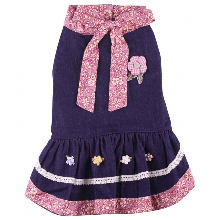 Dieses dunkelblau Kleid von Doggydolly Hundemode untersteicht den eher schüchternen, zurückhaltenden Charakter Ihrer kleinen Prinzessin. Das Hundekleid ist in einem dunklen Blauton gehalten. Der Kragen ist mittig zu einem Schleifchen gebunden und rot. Auch der Rocksaum ist in einem Rotton gehalten. Rechts oben auf dem Rücken ist ein kleines Blümchen aufgenäht. Ein weißes Band, das auf dem Rock angebracht ist, peppt das Ganze nochmal auf. Als kleines Highlight ist eine Reihe kleiner Blümchen auf dem Rock angebracht. Das Kleid gibt es auch in hellblau.