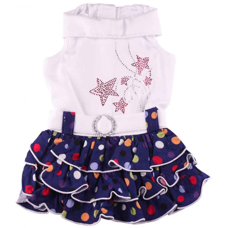 Dieses Kleid für Hunde hat ein weißes Oberteil auf dem eineige kleine Sternchen zu sehen sind. Der dunkle Rock ist bunt gepunktet und wird von einem kleinen weißen Gürtelchen gehalten. Das Kleid ist auch in gold erhältlich.