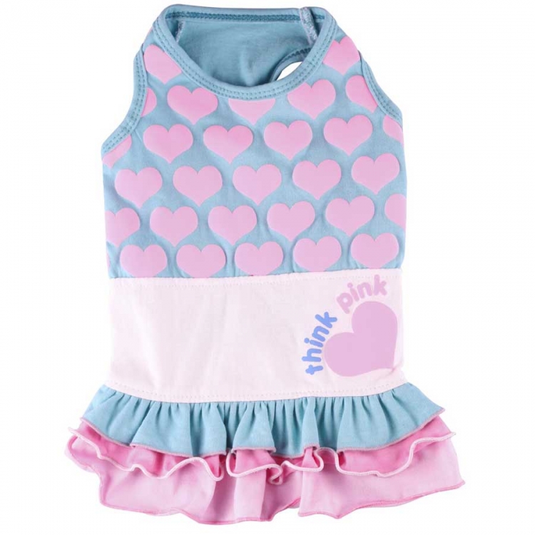 Das süße Kleid von Doggydolly Hundemode ist genau das richtige Outfit für heiße Sommertage. Das Hundekleid besteht aus einem hellblauen Tanktop mit rosa Herzprint und einem dreifarbigen Lagenrock. Das Kleid ist ein optimaler Sonneschutz für den Hund.