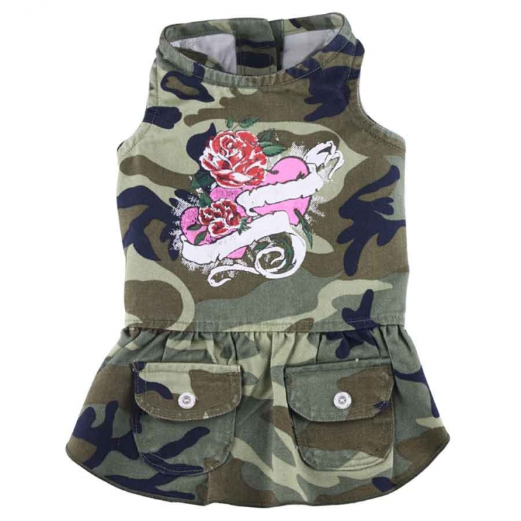 Dieses Jeanskleid in Camouflageoptik mit Rosenmotiv von Doggydolly Hundemode kann wirklich überall un zu jeder Gelegenheit getragen werden. Das grüne Hundekleid besteht aus einem Jeans-Tanktop und einem leicht ausgestellten Jeansrock. Auf dem Rücken des Oberteils ist ein Aufdruck mit zwei roten Rosen und zwei rosa Herzen. Der Rock hat zwei aufgesetzte Leckerli-Taschen, die mit weißen Blümchenknöpfen geschlossen werden.