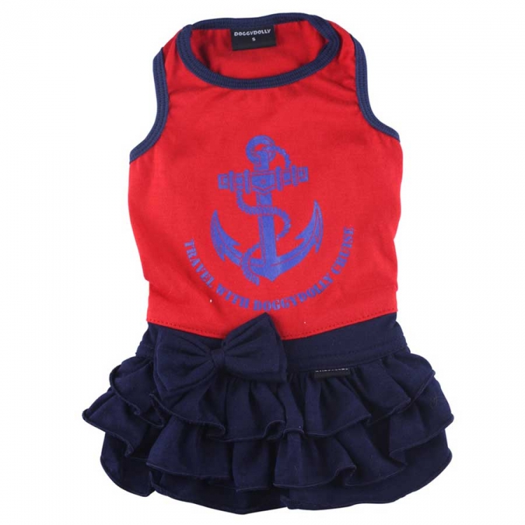 Genau das richtige Outfit für reiselustige Vieberiner - das sportliche blau-rote Kleid von Doggydolly Hundemode lässt Urlaubsstimmung aufkommen. Das Hundekleid besteht aus einem roten Tanktop und einem dunkelblauen Lagenrock. Das Hundeshirt trägt einen Aufdruck mit blauem Anker. An der Taille trägt das Kleid für Hunde eine Zierschleife in dunkelblau.