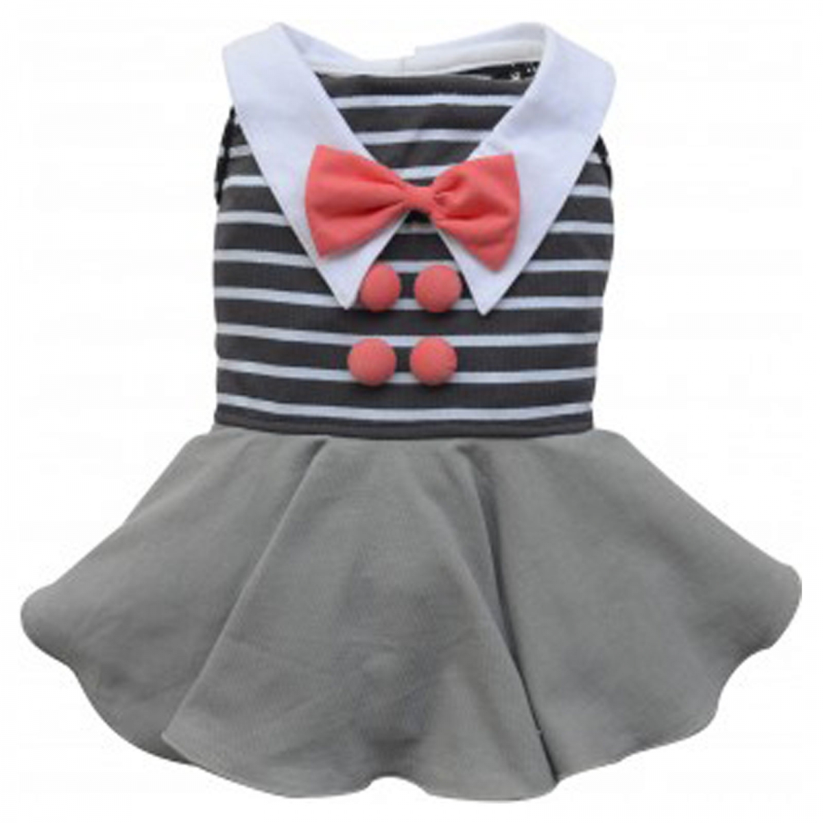 Niedliches Kleid für kleine Hunde aus der DoggyDolly Kollektion mit schwingendem grauen Rock, Kragen und süßer Schleife am blau-weiß gestreiften Oberteil. Das ärmellose Hundekleid ist nicht nur ein superschickes Outfit, es ist leicht, sitz bequem und hat eine gute Passform. Waschbar bei 30°C. Größe XS Brust 31-33cm, Rücken 18-20cm