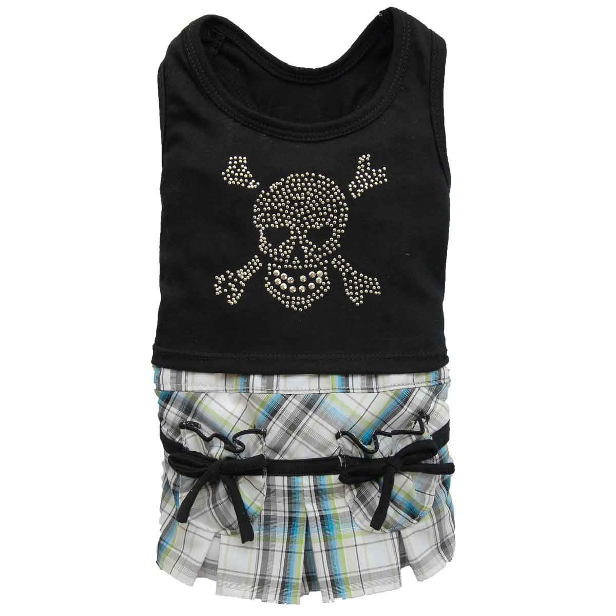 Das leichte Sommerkleid für Hunde aus der DoggyDolly Kollektion hat wirklich ein megacooles Design. Das Top des Hundekleides ist schwarz und hat auf dem Rücken eine Strassapplikation in Form eines angesagten Totenkopfes. Der Hunderock ist kariert und hat trendige Schleifen. Hier habe wir das perfekte Outfit für die selbstbewusste Hundedame! Der T-Shirtstoff ist leicht dehnbar, so dass das Hundekleid eine superbequeme Passform hat und sehr leicht anzuziehen ist. Waschbar bei 30°C. Größe XL Brust 51-53cm, Rücken 33-35cm