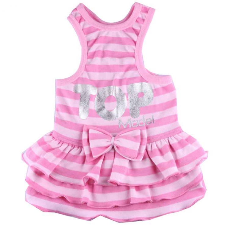 Dieses Hundekleid von Doggydolly Hundebekleidung ist der absolute Renner! Das Kleid ist gestreift in einem helleren und einem dunkleren Rosaton. Das Oberteil des Sommerkleides für Hunde ist ein Tanktop mit dem silbernen Aufdruck "Top Model". Als Trennung zum Rock ist ein süßes Schleifchen angebracht. Der dazu passende Rock ist leicht wellig und hat drei unterschiedlich lange Stufen. Dieses Sommerkleid für Hunde gehört in den Kleiderschrank jeder kleinen Diva! Durch den leicht elastischen Baumwollstoff ist das Kleid angenehm zu tragen und engt den Hund nicht in seiner Bewegungsfreiheit ein.