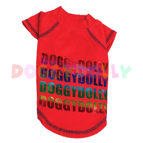 Dieses T-Shirt ist genau das Richtige für Hunde, die gerne im Mittelpunkt stehen. Es ist knallig rot und mit schwarzem Garn abgenäht. Über den Rücken ist ein großer Aufdruck angebracht, der den Labelnamen Doggydolly in verschiedenen, schimmernden Farben zeigt. Dieses Hundeshirt ist auch in den Farben grün, schwarz, weiß und braun erhältlich.
