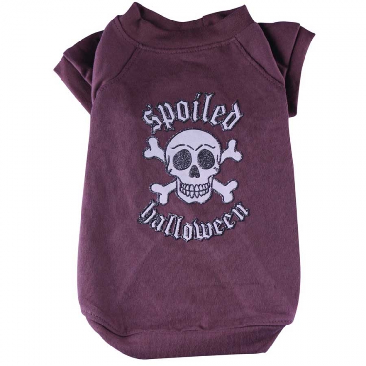 Dieses T-Shirt für Hunde von Doggydolly Hundemode ist grau und hat einen großen Aufdruck. In der Mitte ist ein Totenkopf zu sehen und die Worte Spoiled Halloween. Das Hundeshirt ist auch in den Farben gelb, rosa und schwarz erhältlich.