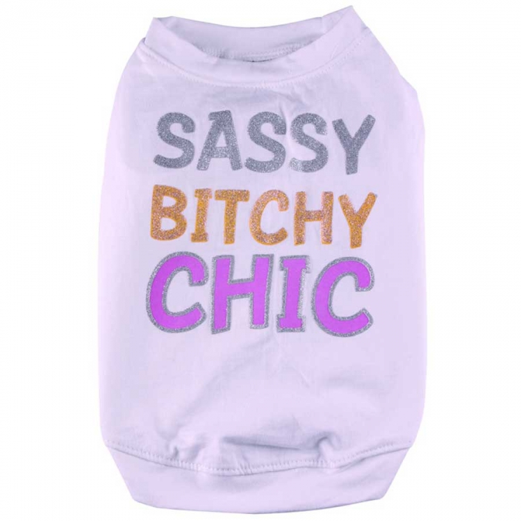 Freches Hundeshirt aus Baumwolle in weiß mit bunter Aufschrift auf der Rückenpartie. Das T-Shirt für Hunde von Doggydolly wikt durch seinen bunten Aufdruck "Sassy Bitchy Chic" sehr verspielt und ist genau das richtige für Ihre freche Hundedame.