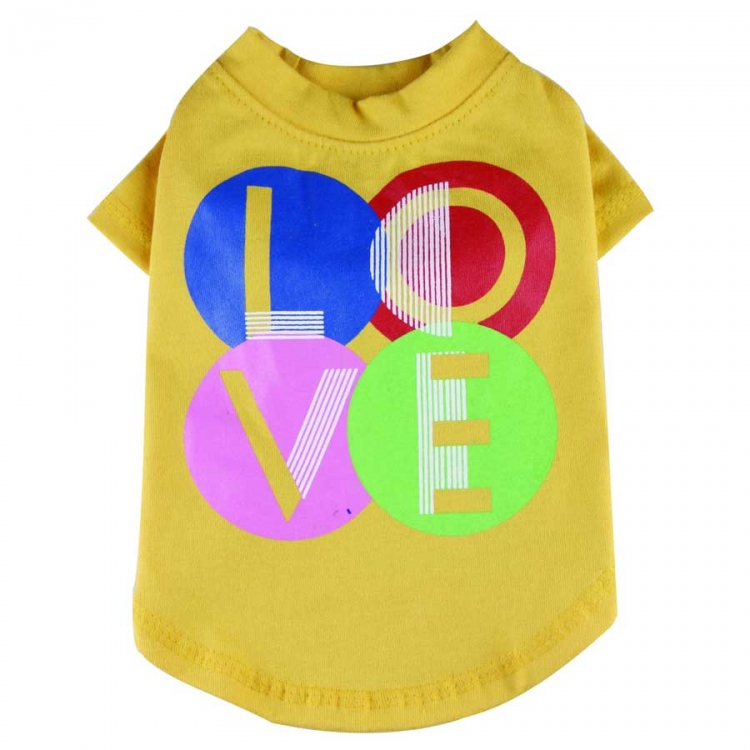 Dieses farbenfrohe Hundeshirt wurde vom Designerlabel Doggydolly Hundemode designed. Das T-Shirt für Hunde ist gelb und hat das mehrfarbige Wort "Love" auf den Rücken aufgedruckt.