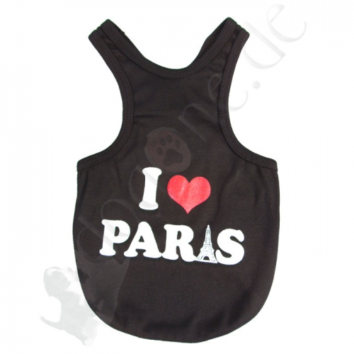 Für alle Paris-Romantiker... Das Hundeshirt von Doggydolly darf auf der Reise nach Frankreich nicht fehlen. Das Hundetanktop hat einen Aufdruck der die Worte "I love Paris" und einen stilisierter Eifelturm zeigt. Dabei wurde das Wort "love" durch ein rotes Herz ersetzt.