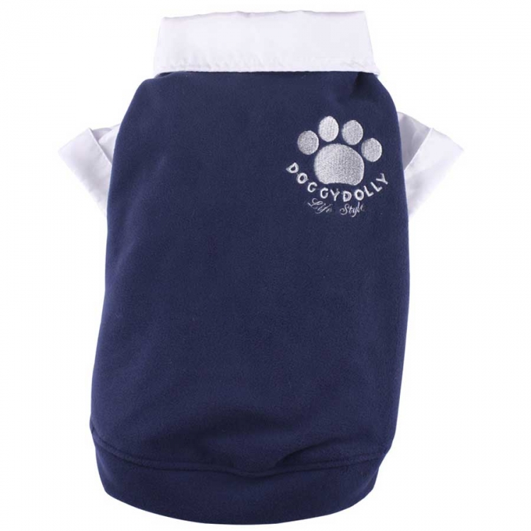 This high-class, warm slipover is the perfect clothing for the dinner at the restaurant during colder days. The blue fleece pullover for dogs with the white shirt sleeves and collar andthe embroidered paw makes your dog look very elegant. Details: blue fleece, white cotton shirt. Size XS chest 31-33cm, back 18-20cm