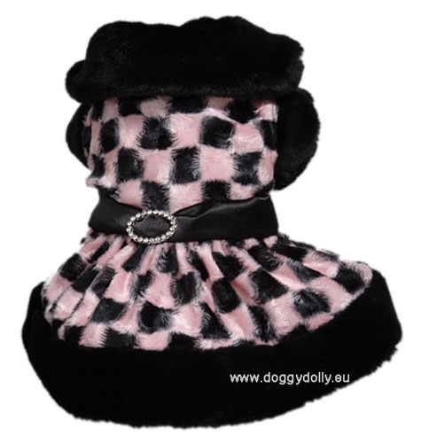 This designer coat is a real eye-catcher. Extravagant and cosy soft - the favourite coat for cold days. Details: artificial fur coat pink-black with plush col and plush lining in black belt with rhinestone buckle