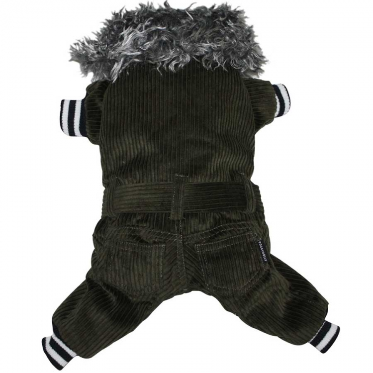 The green corduroy overall by Doggydolly dog fashion keeps your dog really warm during the the winter. The dog coat with four legs is classic in its design and has a fake fur collar. The elastical cuffs arrange for the perfect fitting. The overall is closed on the belly by a Velcro strip. This dog overall also exists in grey.