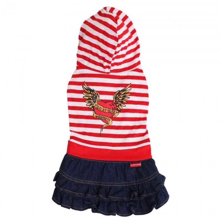 That cool skirt looks as if it was a two-part wear Nice jeans and pleated skirt with a red ans white striped top and a red heart with wings suitable to every activity Alsa available without hoot and without sleeves