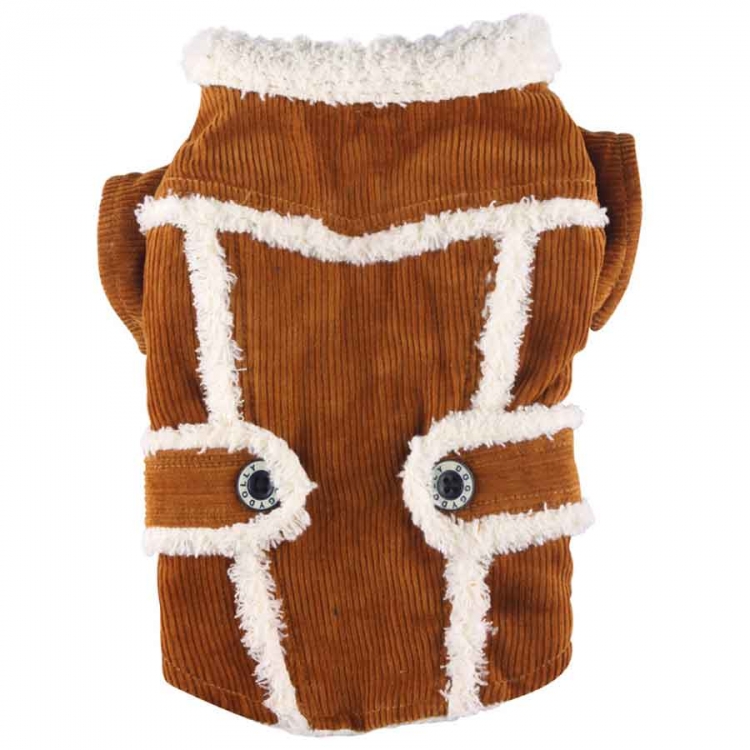 Brown corduroy jacket by Doggydolly dog fashion - perfect for cold winter days! The plain dog coat is costumised by fake fur borders. Due to its velcro strip it is very easy to wear. This dog jacket also exists in cream and dark red.