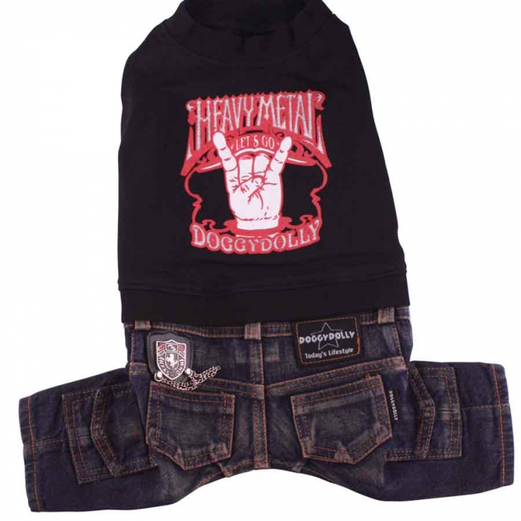 Cette combinaison en jean attire tous les regards lors des fêtes de plein air! Le haut rouge avec la grosse impression ainsi que le pantalon en jean est l'idéal pour les entre-saisons et garde votre chéri bien au chaud. Détails: -poches sur les côtés et le derrière du pantalon pour y glisser quelques friandises -jean bleu foncé -shirt noir