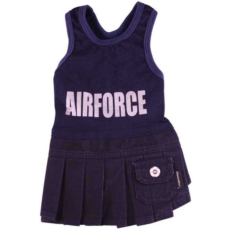 Combinaison de débardeur bleu marine avec l'inscription brillante "Airforce" et la jupe plissée à poche qui peut servir de stock de provisions pour la petite faim en cours de route. Taille: Longueur du dos Tour de poitrine XS 25cm, 30cm S 28cm, 32cm M 31cm, 36cm L 32cm , 42cm XL 36cm , 44cm XXL 42cm , 48cm"