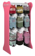 Les côtés des étagères sont en forme d'os en couleur rose, la plaque centrale est en couleur argent.La fabrication des présentoirs est faite en Allemagne en plaques de mélanine de 19 mm.Les 9 crochets sont inclus dans la livraison. Pour garnir les 2 côtés de l'étagère, vous pouvez commander 9 autres crochets supplémentaires pour le deuxième côté.Frais de livraison supplémentaires
