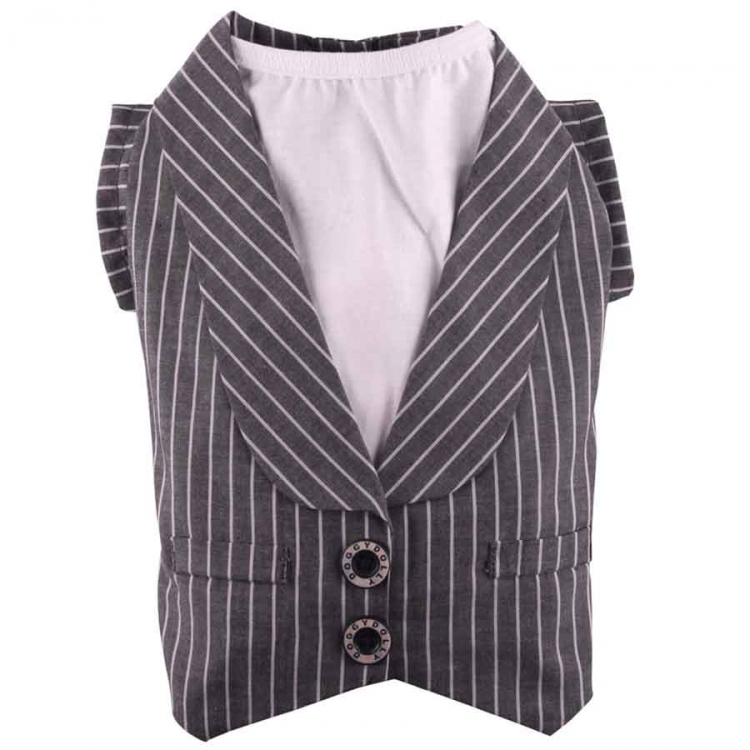 Le chien branché mode porte ce smoking léger à rayures fines est l'idéal pour un rendez-vous avec sa dame ou aussi au dîner. Les deux boutons donne style à la fois sportif et élégant à l'habit. Quelle dame de chiens pourrait résister à cela... Détails : Veston gris avec les fines rayures blanches boutons le T-Shirt blanc intégré Taille: Longueur du dos Tour de poitrine XS: 19cm , 29cm S: 22cm , 34cm M: 27cm, 40cm L: 29cm, 42cm XL: 33cm , 47cm XXL: 35cm, 50cm
