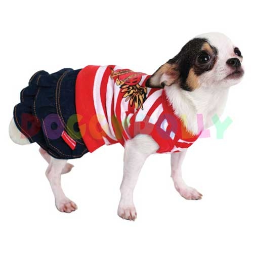 Cette robe donne l'impression que ce sont deux habits Jupe en jean à volants et le T-shirt aux rayures rouges et blanches avec une image imprimée d'un coeur avec des ailes. Convient à chaque activité Disponible aussi avec capuchon et manches