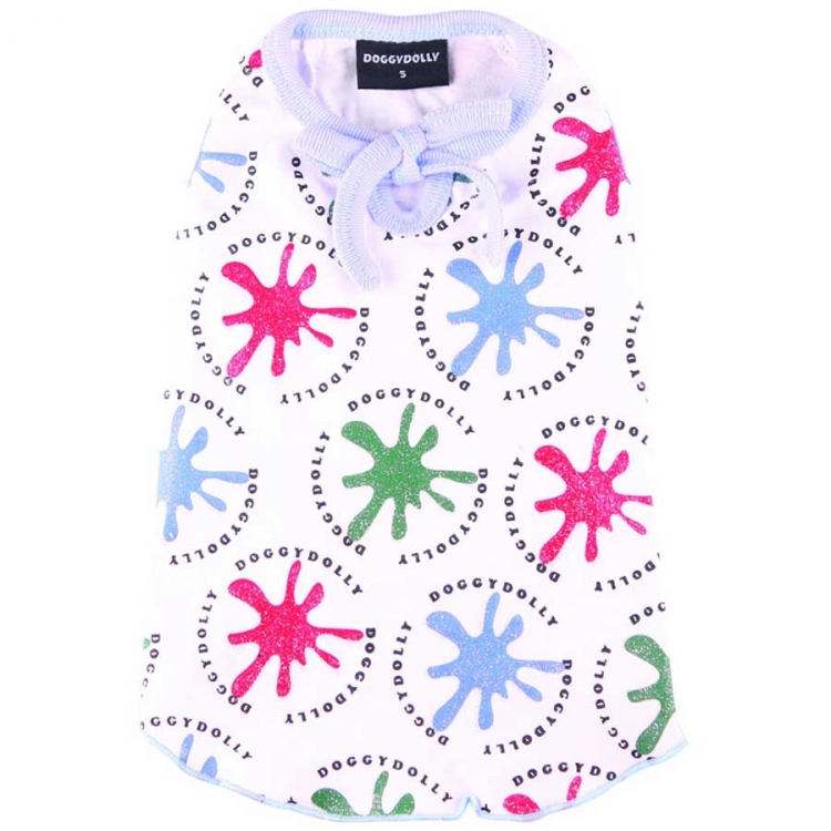 Robe mignon en blanc pour chienne avec de tâches de peinture multicolores et un noeuds sur le dos. Pour les belles fêtes d'été ou les ballade en ville. Existe aussi en rouge.