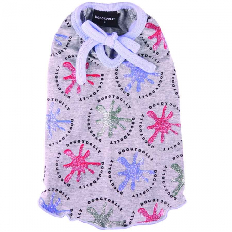 Super T-shirt gris pour chien avec noeud bleu de fillette au niveau du cou. Les impressions de tâches de peintures donnent un effet artistique à ce T-shirt. Tres beau shirt pour votre chien.
